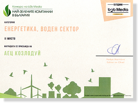 Ролята на АЕЦ “Козлодуй” за опазването на природата бе оценена от b2b Media и през 2015 г., когато атомната централа получи грамота “Зелена иновация” в петото издание на същия конкурс.