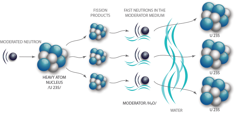 In the slow neutron reactors, the nucleus fission is received as a physical interaction, from the collision of the delayed neutron with a heavy atom nucleus (uranium 235 nucleus). The collision splits the nucleus in fragments called fission products. This process results in the emission of fast neutrons and heat. After the power of the generated fast neutrons is decreased in the moderator (water), they collide with other heavy nuclei and the process repeats. This process is called "chain reaction", which is controlled by changing the number of slow neutrons. The heat, released during the process, is used to produce steam that drives the turbines, as in the conventional thermal power plants. In order to cool down the fuel and to delay the neutrons in WWER reactors, pure water is used as a coolant.