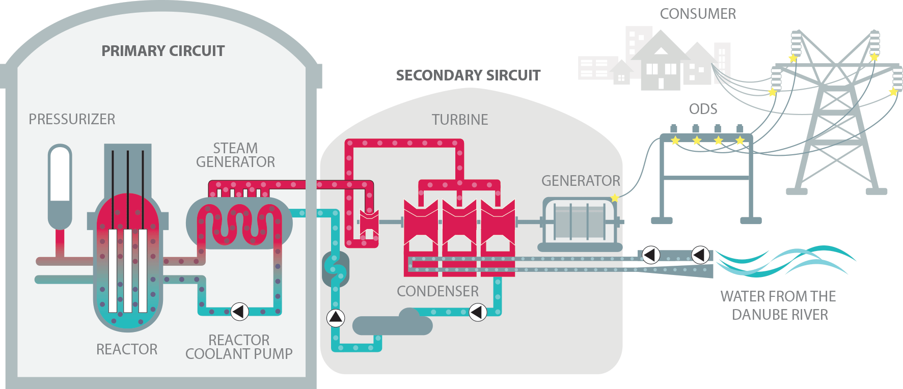The secondary circuit which is nonradioactive, is designed to take the thermal power from the primary circuit and to transform it into kinetic power of the steam turbine rotation. This energy is converted into electricity in the generator, thus the high effectiveness of the process being provided. By means of a switch-gear, the electricity is transferred through the grid to the consumers.